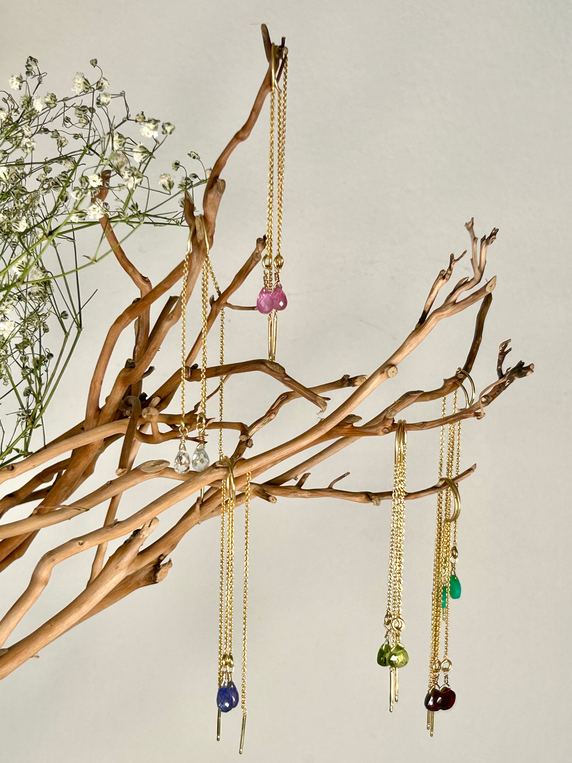 Handcrafted in 925 silver plated with 18kt gold , they feature a thin chain that crosses the lobe and ends with a selected natural gem , chosen for its purity, brilliance and intensity of colour.